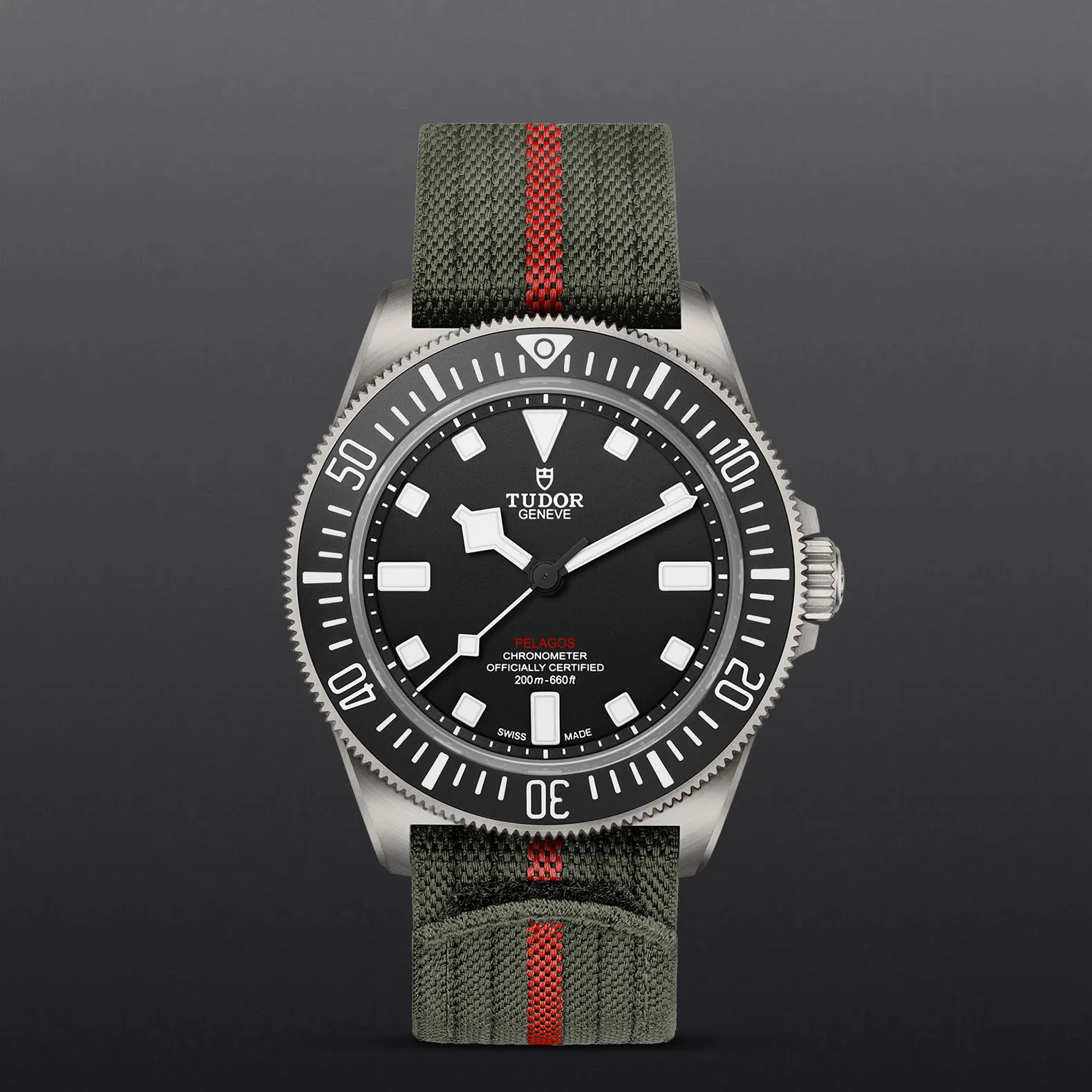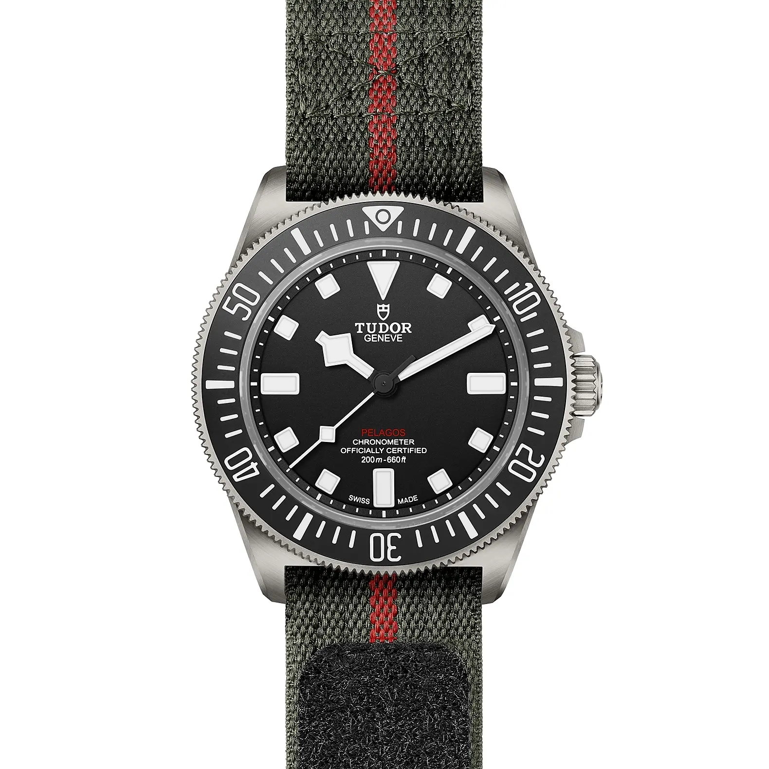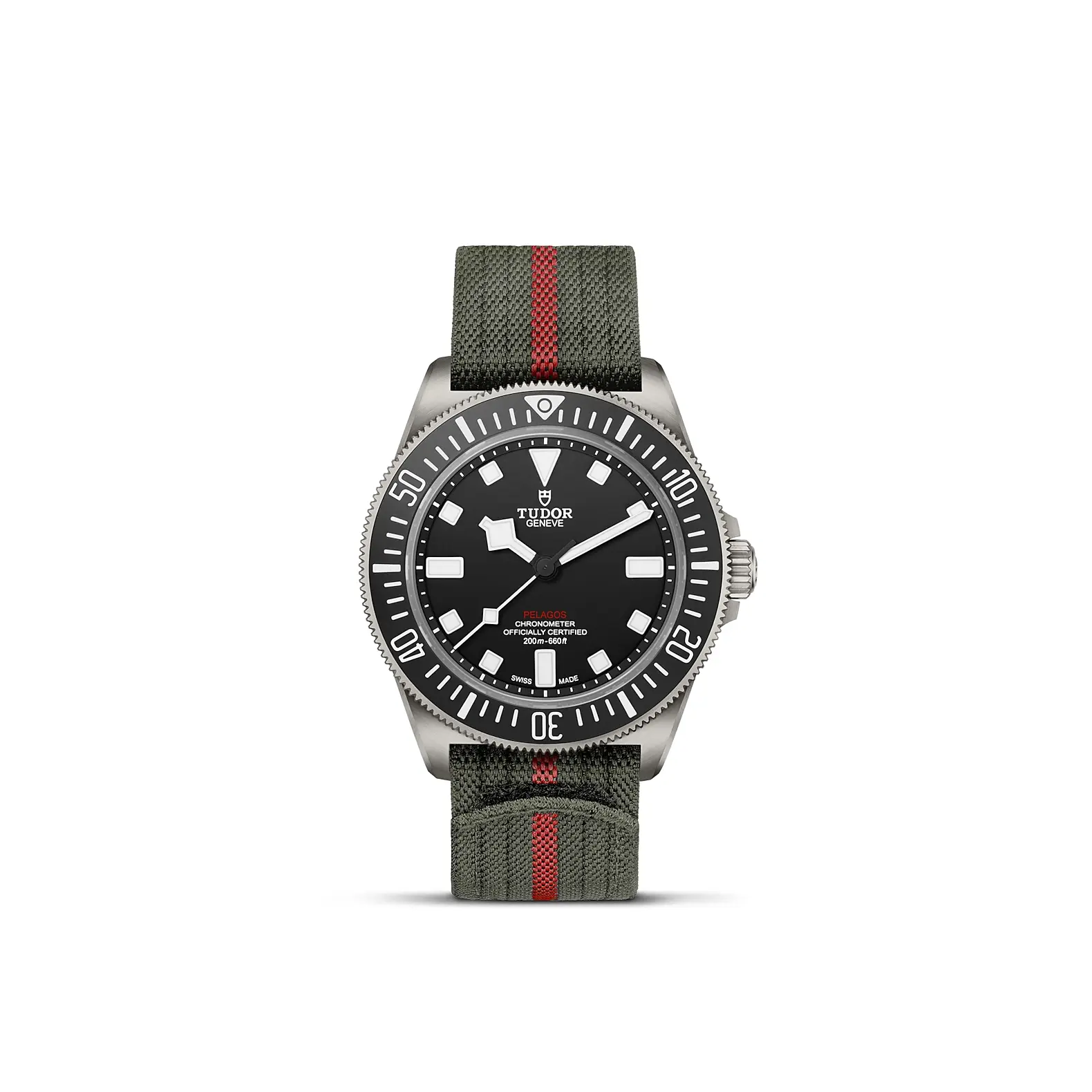 Cassa in titanio, 42 mm, Cinturino in tessuto verde con banda rossa.