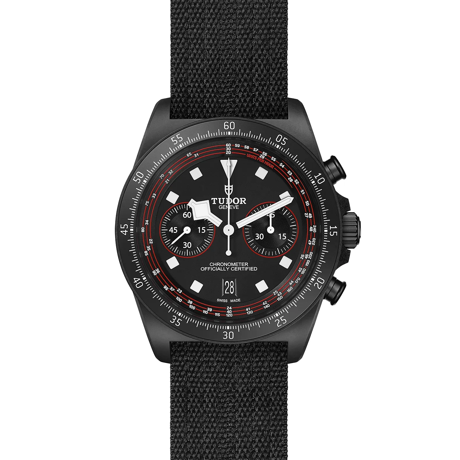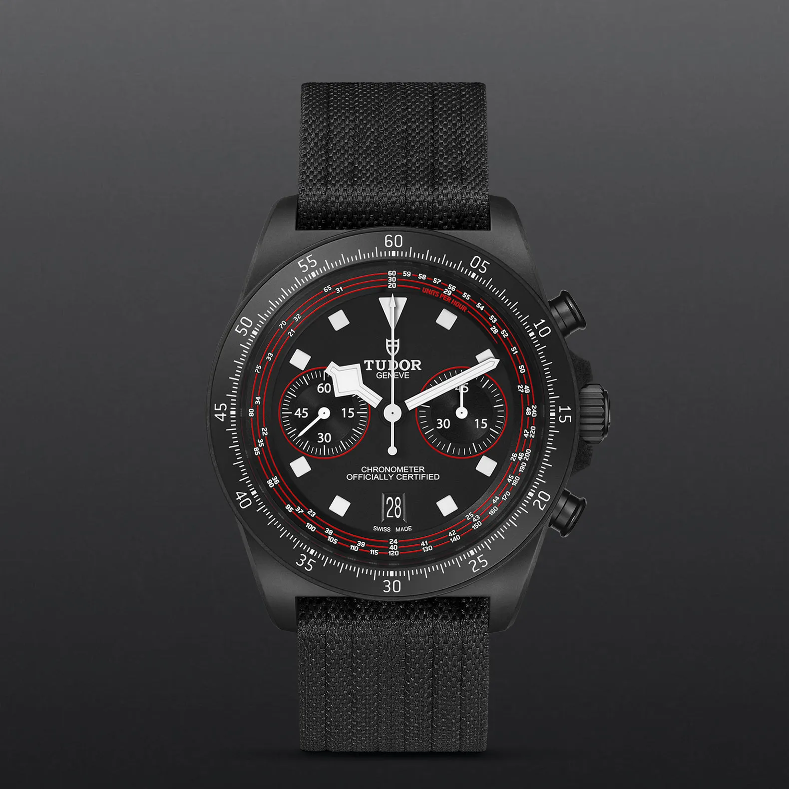 Cassa in composito di carbonio nero, 43 mm, Cinturino in tessuto nero.